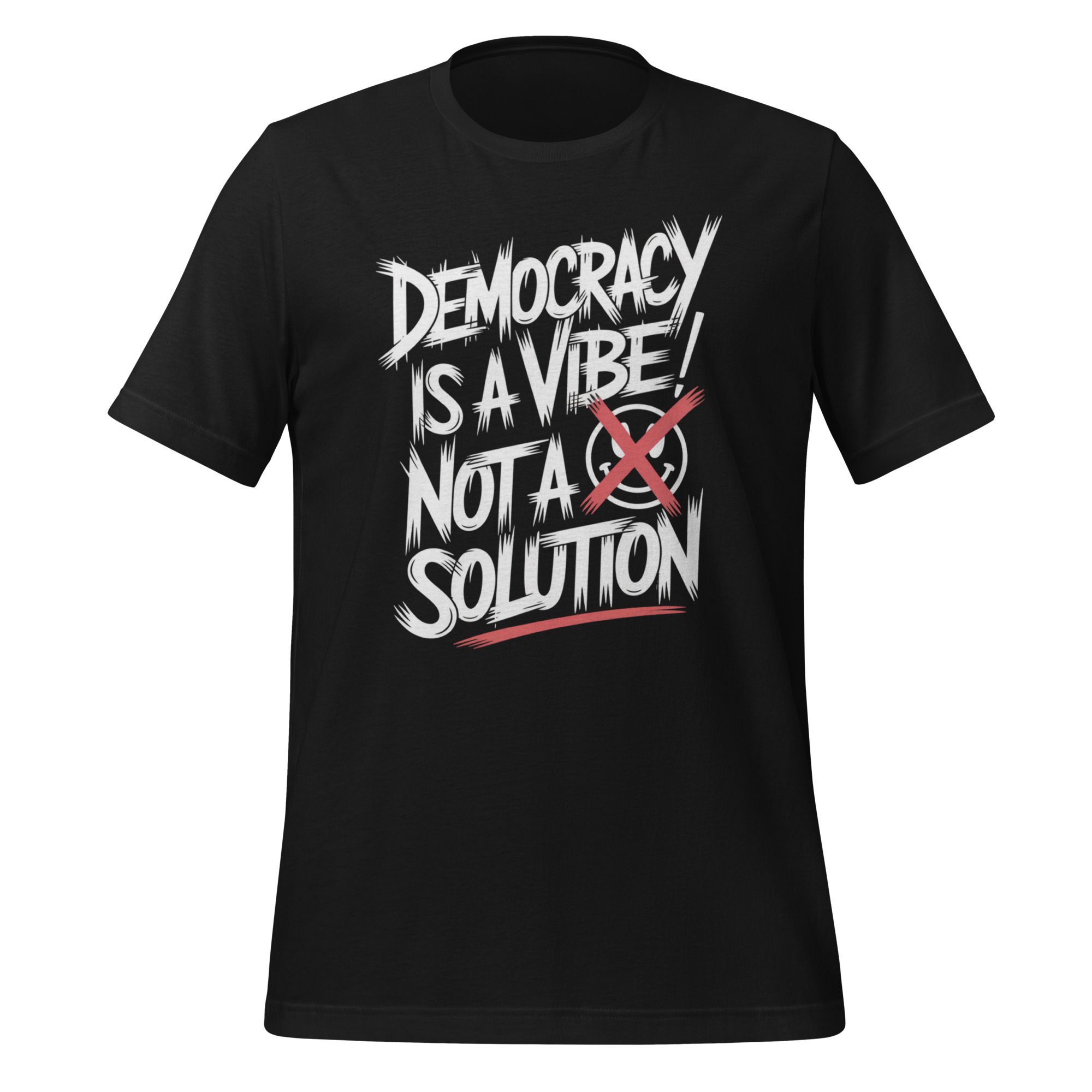 The Democracy Is a Vibe Not a Solution tee delivers a sharp piece of cultural commentary in a clean, statement-first design. The phrase points to the gap between symbolic participation and practical outcomes, highlighting how sentiment and optics can overshadow effectiveness in modern systems.