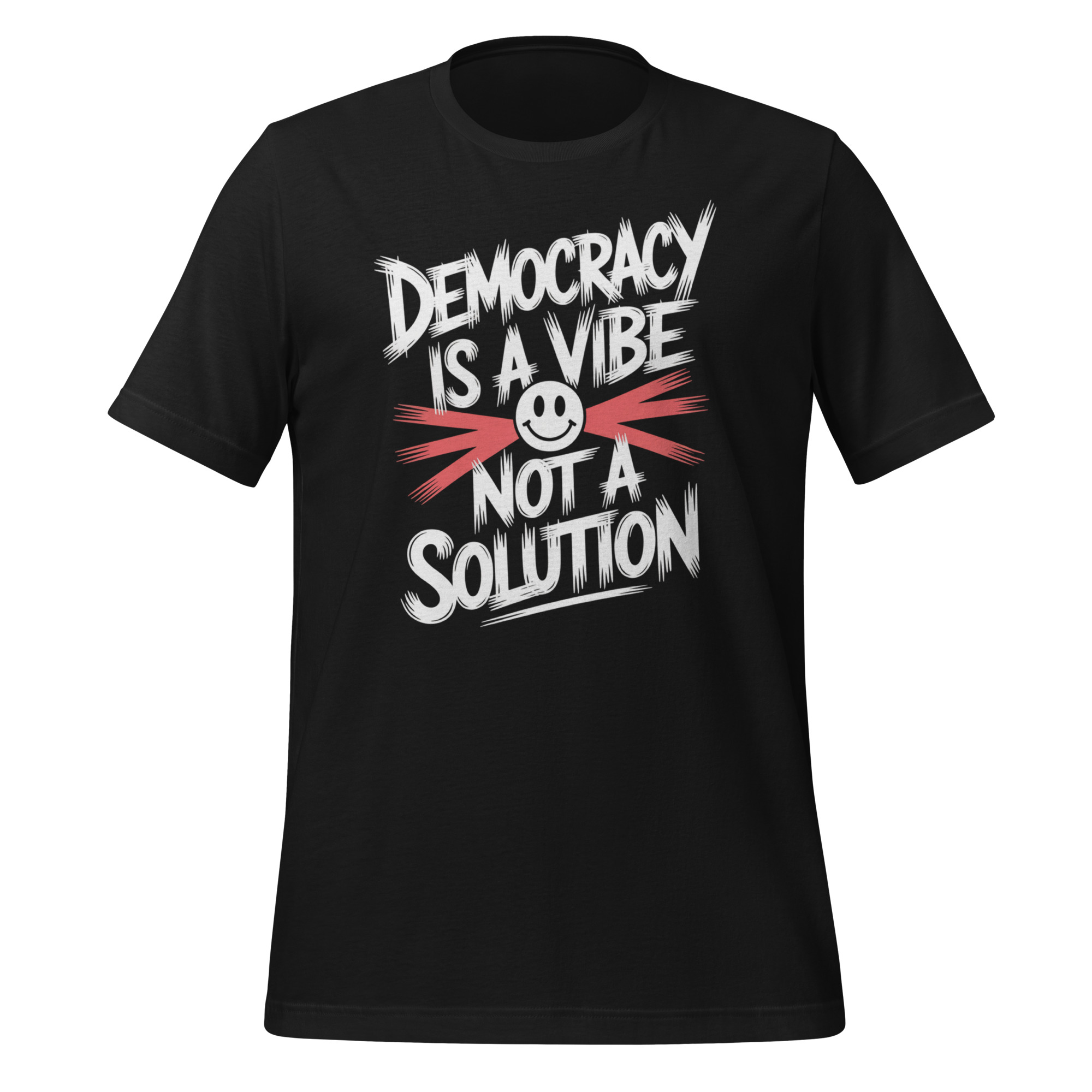 The Democracy Is a Vibe Not a Solution tee features a bold, readable statement design that critiques modern political systems in a thought-provoking way. The phrase highlights the difference between appearance and substance, suggesting that feelings and trends often replace meaningful governance.