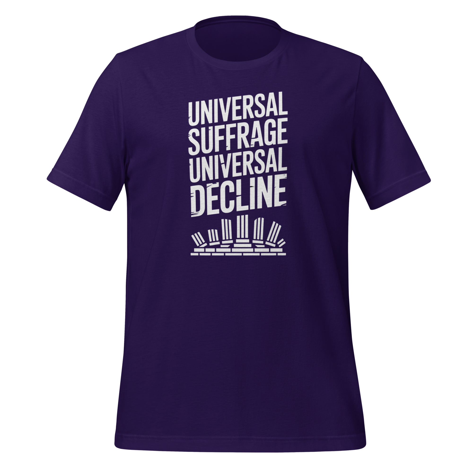 The Universal Suffrage, Universal Decline tee features a bold, minimalist statement design that offers a critical reflection on modern democratic systems. The phrase emphasizes skepticism about whether mass voting automatically produces meaningful governance or societal stability.