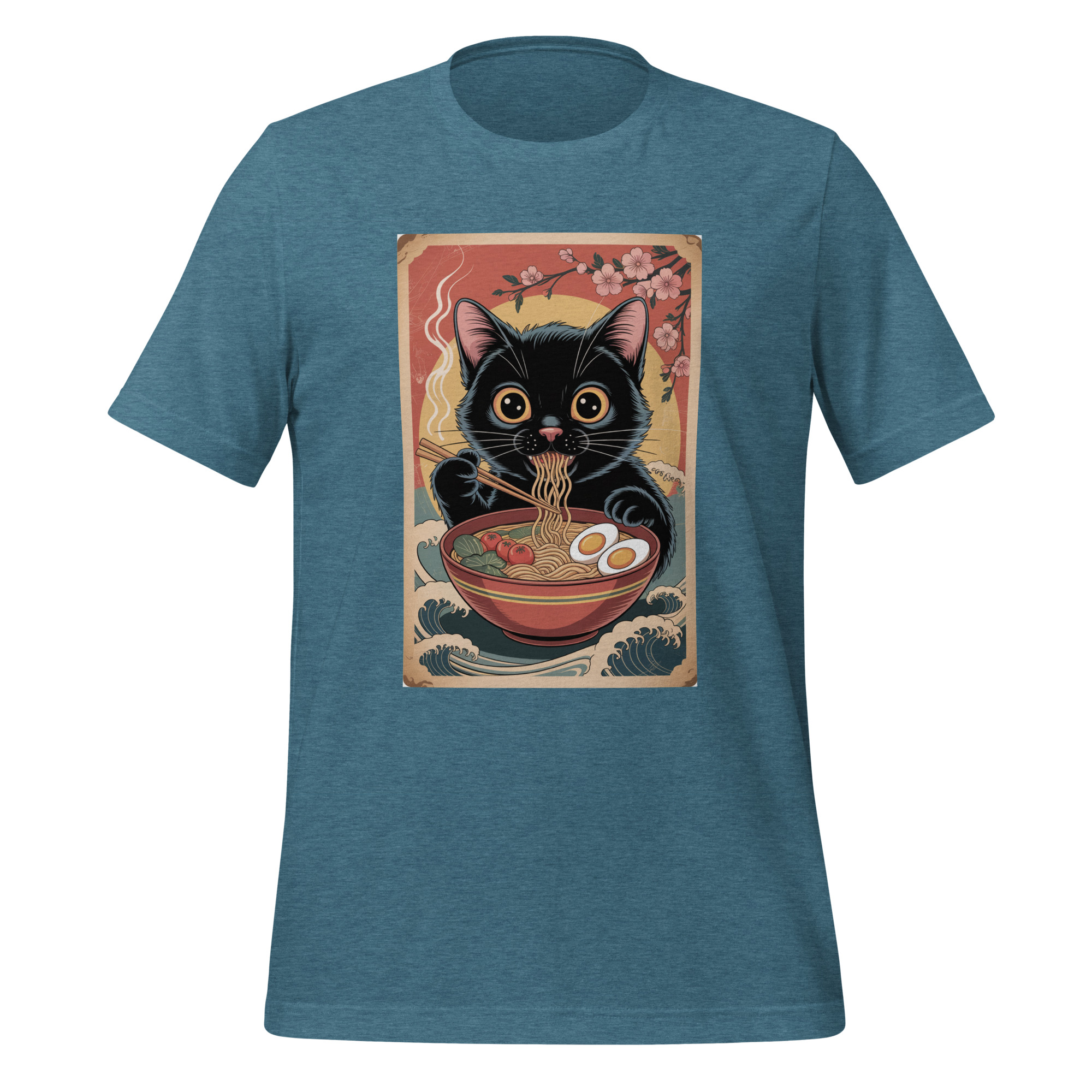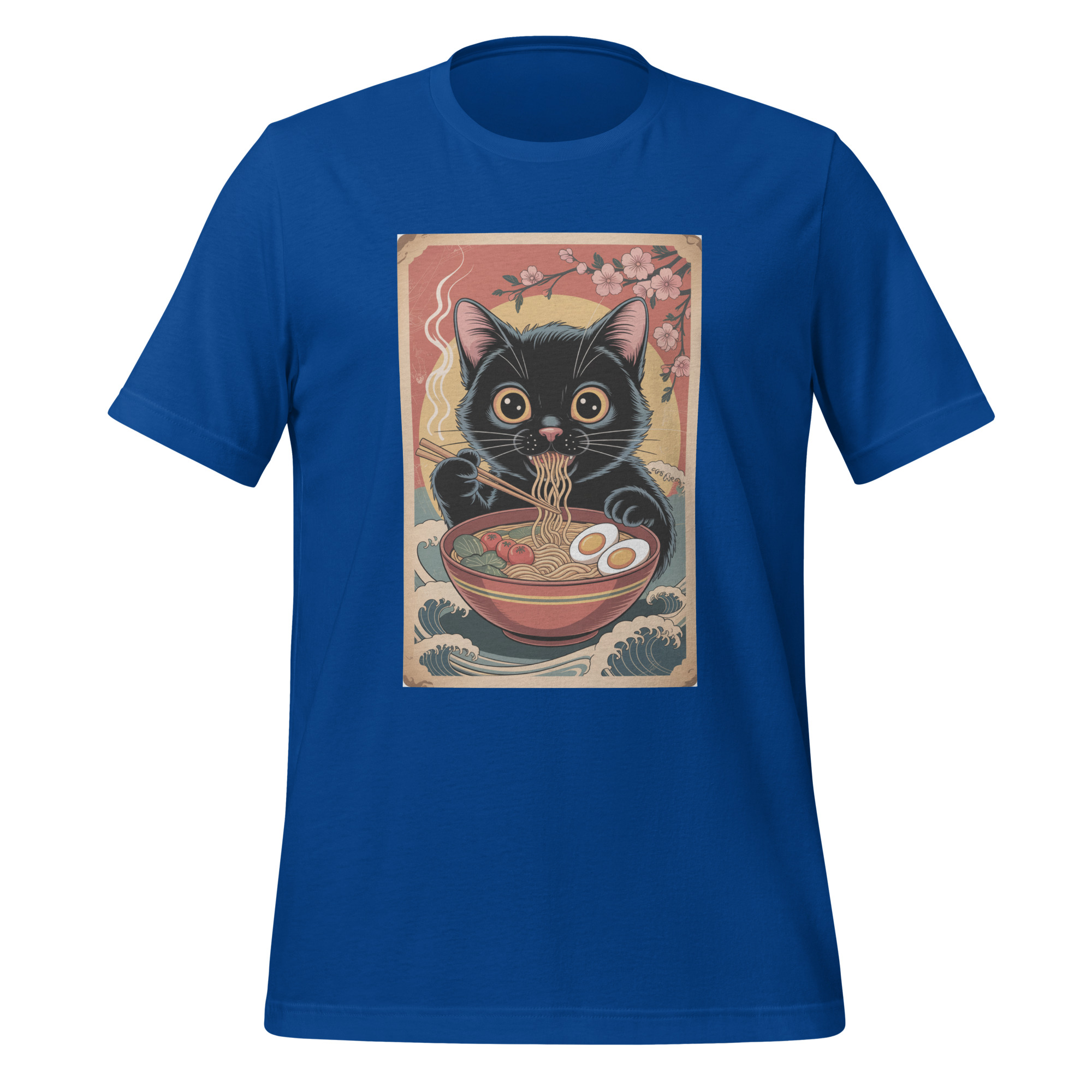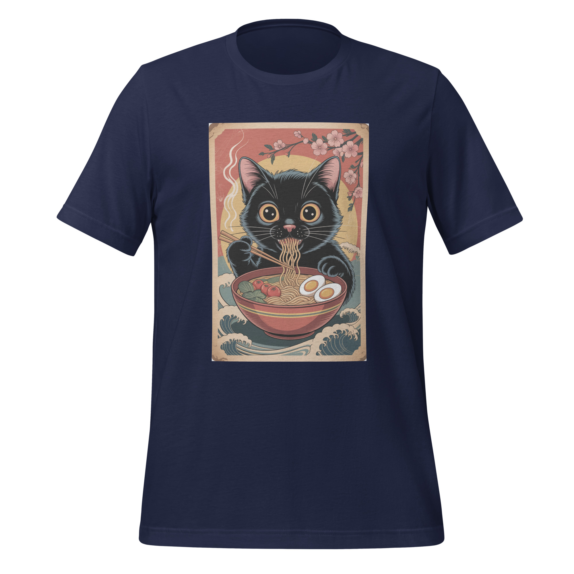 This vintage-inspired graphic goes beyond a simple cat shirt. The “cat eating ramen” motif taps directly into the popular and enduring trends of anime-adjacent art, foodie humor, and vintage animal illustrations. It resonates with collectors of unique cat merchandise, fans of Studio Ghibli’s charming aesthetic, and anyone drawn to the cozy, comforting vibe of both cats and a hot meal. The design evokes a sense of relaxed, humorous nostalgia, making it a perfect casual wear choice for cat cafe outings, cozy days in, or connecting with fellow fans of quirky animal designs. It’s a standout gift for the cat lover who appreciates subtle wit, the ramen aficionado, or anyone with a distinctive, fun-loving style.
